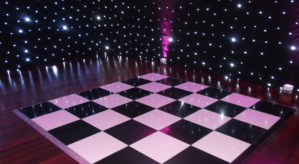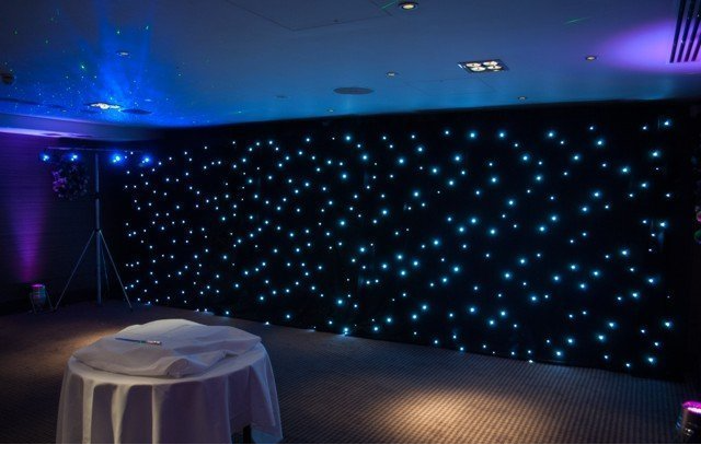 Our black starlight backdrop can be adjusted up to 3 meters high and between 3 meters and 6 meters wide. We can add several cloths together to go around the room.